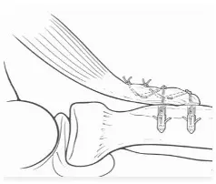 Abbildung: Fixieren der Bizepssehne mittels Fadenankern an der Speiche (Schemazeichnung).